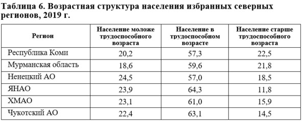 При сравнении индикатора доли трудоспособного возраста может показаться, что НАО имеет схожий возрастной состав с Республикой Коми и Мурманской областью (57—59%), в то время в возрастной структуре ЯНАО, ХМАО и ЧАО доля трудоспособных составляет более 60%. Однако обратимся к табл. 6, где представлена возрастная структура населения за 2016 г. Сходство с Мурманской областью обманчиво: в последней (и в Республике Коми) доля трудоспособных снижена за счет стариков, а в НАО – за счет молодежи! Доля лиц моложе трудоспособного возраста здесь наибольшая (24,5%).