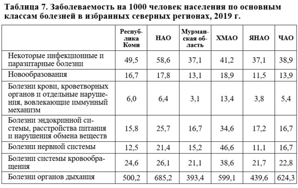 При сравнении структуры заболеваемости по типу заболеваемости (табл. 7), тундровый Ненецкий автономный округ закономерно имеет схожую структуру с Чукотским автономным округом.