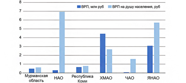 Рис. 22. ВРП и ВРП на душу населения в избранных северных регионах, 2019 г. Источник: Росстат30