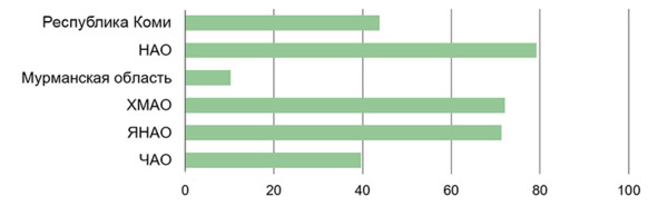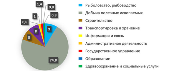Экономики всех арктических регионов в значительной степени зависят от добычи полезных ископаемых, однако структура ВРП НАО наименее диверсифицирована: 74,8% ВРП составляют доходы от добычи полезных ископаемых в регионе (рис. 23).