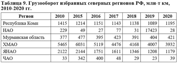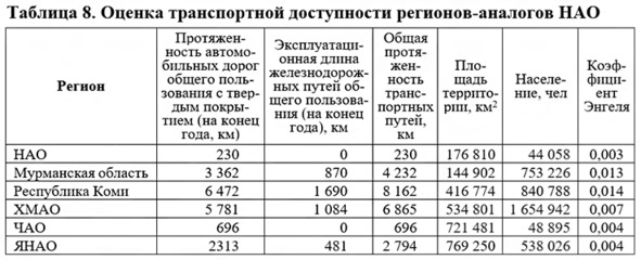 Из результатов вычислений следует, что Ненецкий автономный округ имеет самую низкую степень транспортной доступности среди регионов-аналогов, в том числе по сравнению с ЧАО и ближайшим соседом – ЯНАО. Как и в ЧАО, в НАО нет железнодорожных путей сообщения, однако протяженность автомобильных дорог при этом совсем невелика (и там, и там, наземное транспортное сообщение в значительной степени осуществляется по зимникам). Неудивительно, что по грузообороту Ненецкий автономный округ сильно отстает от других регионов-аналогов (табл. 9).