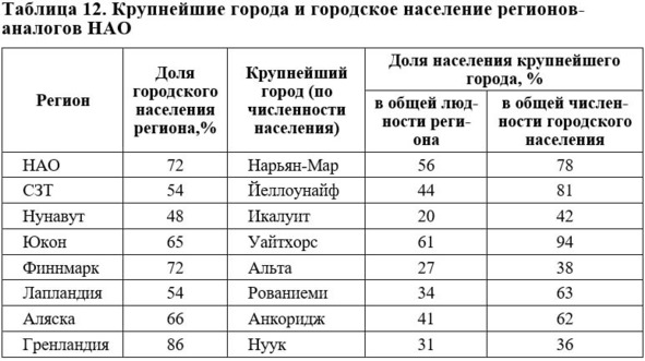 Доля городского населения НАО составляет 72% – столько же, сколько в норвежском Финнмарке (табл. 12). При этом в крупнейшем городе округа проживает свыше половины всех жителей региона, в то время как в норвежской Альте только чуть более четверти. По доле крупнейшего центра в общей людности округа НАО уступает только Юкону. Более урбанизированной, чем НАО, является территория Гренландии – правда, здесь нужно учесть особенности статистического учета: городским поселением в Гренландии вполне может считаться поселок с населением в 200 человек.