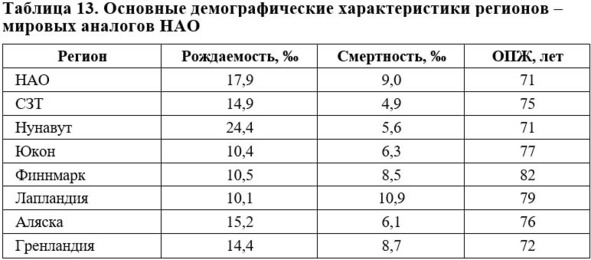 А вот показатель смертности в НАО – почти самый высокий среди регионов-аналогов. Округ опережает только Лапландия, где отмечается в то же время и наибольшая доля лиц пожилого возраста (табл. 13). Ближайший аналог НАО по значению общего коэффициента смертности – Гренландия. Невысокими значениями от НАО особенно отличаются Северо-Западные Территории и Нунавут. В этих провинциях существенно ниже доля лиц пожилого возраста: в Северо-Западных Территориях – в 2,5 раза, в Нунавуте – в 4,5.