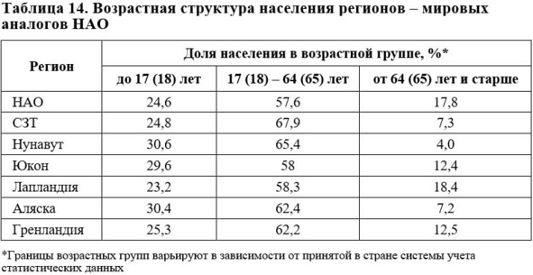В возрастной структуре НАО наблюдается невысокая доля лиц трудоспособного возраста – самая низкая среди регионов-аналогов. Близкие значения отмечаются в Лапландии и Юконе (табл. 14).