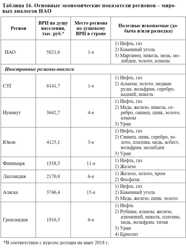 По душевому ВРП среди регионов-аналогов Ненецкий автономный округ занимает второе место, уступая только Северо-Западным Территориям (табл. 16).