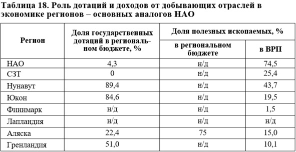 Значительная часть прибыли от добычи полезных ископаемых в НАО поступает в федеральный бюджет. Дотационность регионального бюджета округа составляет 4,3%. Аналогом являются Северо-Западные Территории, которые в последние годы вообще не получают дотаций (табл. 18).
