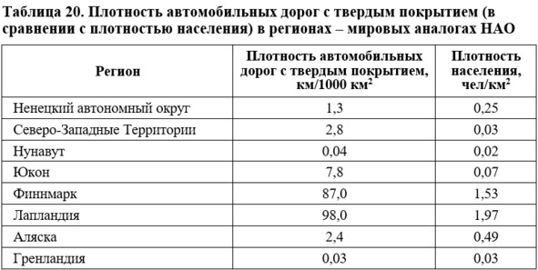 При этом в Северо-Западных Территориях и Юконе, где кратно ниже плотность населения, плотность автодорожного полотна с твердым покрытием выше. В отличие от НАО, на Аляске, в Северо-Западных Территориях и Юконе, автомобильное сообщение между населенными пунктами все же присутствует, хотя и в очень ограниченных масштабах.