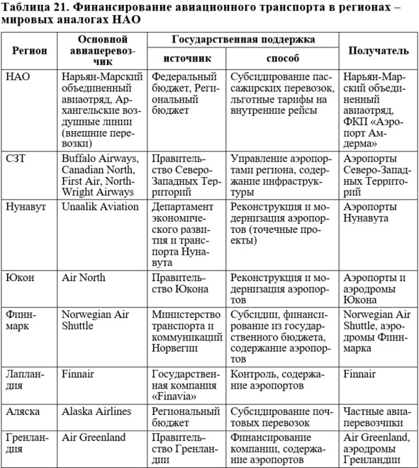 Основные внутренние перевозки в Ненецком автономном округе осуществляет компания-монополист ОАО «Нарьян-Марский объединенный авиаотряд». Подобная ситуация в структуре авиаперевозчиков наблюдается почти во всех регионах-аналогах, кроме Северо-Западных Территорий, где к числу основных перевозчиков относится три-четыре компании (табл. 21).
