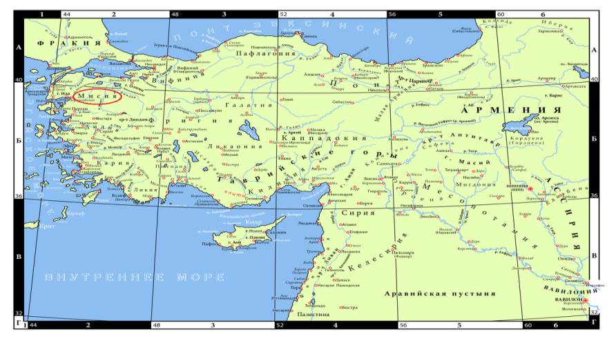 Ми́сия(Мизия,Месия, Мезия). На древне греческом языке звучит, как Μυσία. На латинском языке -Mysia.