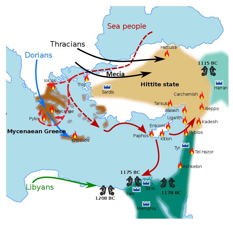 Это были «Народы моря». О народах, обрушившихся на Египет в XIII— XII вв., до н.э. сообщают древнеегипетские тексты на стенах погребального храма фараона Рамзеса III в Мединет-Хабу, в которых они названы «Народами моря» с Севера». Среди них мы находим уже упоминавшихся выше пеласгов и мезийцев,в т.ч.. Все эти народы изображены на рельефах с характерным для них вооружением в сцене морского боя.