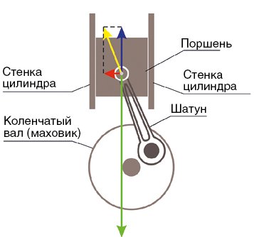 Та часть силы, которая показана красной стрелкой, – это и есть та зловредная составляющая, что портит наш двигатель! Именно она создает нагрузку на стенку цилиндра, из-за нее на стенке появляются царапины, а потом и вовсе глубокая выработка – получается, как говорят автомеханики, «цилиндр яйцом».