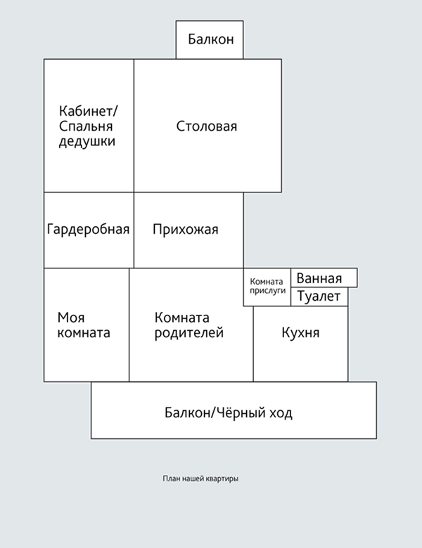 В квартире было пять комнат, одна – тёмная, без окон. Там стояли шкафы и огромный сундук; бывало, спала домработница. Весной туда складывали, обильно пересыпая нафталином, зимние вещи. Самая большая комната с балконом – столовая. Там же стояла кушетка бабушки Иды. Рядом кабинет (он же спальня) дедушки Саши. Книжный шкаф во всю стену, старый большой письменный стол, негатоскоп для просмотра рентгеновских снимков. Ещё одна большая комната – мамы и отца (c 1962-го – только мамы). Мамин большой, покрытый зелёным сукном письменный стол, и моя комната. с огромным глобусом на шкафу.