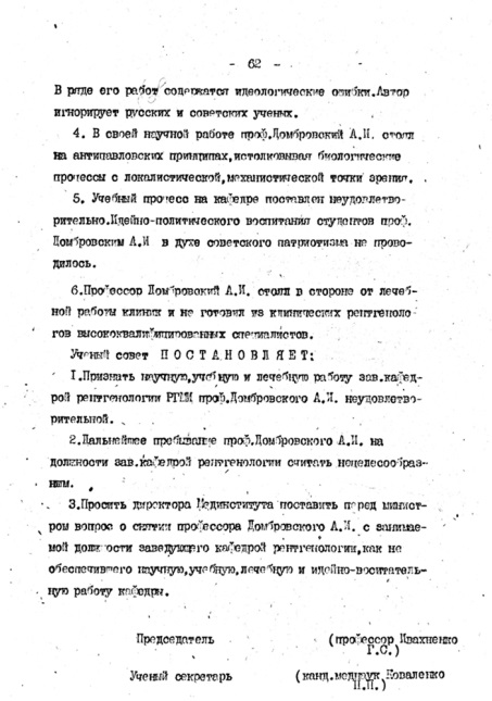 Далее слово взяла Никовалева, сотрудница деда, претендентка на заведование освобождающейся от Домбровского кафедры: «В настоящее время о ценности научной работы судят по степени использования в этой работе достижений передовой отечественной науки, достижений Павловской физиологии, Мичуринской биологии, работ О. Б. Лепешинской. Профессор Домбровский в своих работах далеко отходит от этих принципов. В своей монографии профессор Домбровский говорит, что рентгеновские лучи и радий являются мощными разрушителями многочисленных и разнообразных рецепторов! Ни одно заболевание, которое здесь описано, не только не излагается на основе Павловского учения, но, вы только подумайте! – при лечении предлагается облучение! Причем в непонятных дозах! <…> в сосуды сердца вводится контрастное вещество. Такой способ исследования, конечно, чужд советской медицине…». И далее по мелочам: «Лекции профессора Домбровского аполитичны, не содержат идейной направленности, показывающей достижения советской науки и приоритет советских учёных… Профессор Домбровский имеет немало научных работ, многие из которых публиковались им в заграничной печати. Игнорирует русских учёных… Антипавловские принципы научной работы… Идейно-политическое воспитание студентов в духе советского патриотизма не проводил».