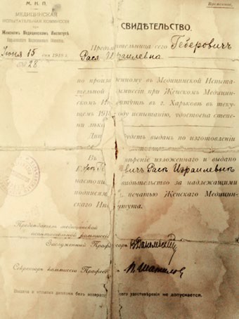 Отец Роси, Израиль Зелманович Геберович, родившийся в 1868 году, служил в банке. Мать, Хая-Рива Берковна Мознаим, 1871 года рождения, – купеческого рода (родословную семьи Мознаим я проследил до 1780 года). Рося училась в лучшей таганрогской женской гимназии. Её подругой-одноклассницей была Фаня (Фанни Гиршевна) Фельдман (Раневская), ставшая великой русской актрисой. Многие годы Рося с Раневской переписывались. В 1914-м Рося поступила в Харьковский женский медицинский институт. Одновременно с другой моей бабушкой, Идой Ошеровской. Так учились в одной группе две мои будущие бабушки. Оканчивали они в июне 1918-го, в разгар Гражданской. По счастью, и Харьков, и Ростов были под белыми: после победы большевиков частный университет был ликвидирован.