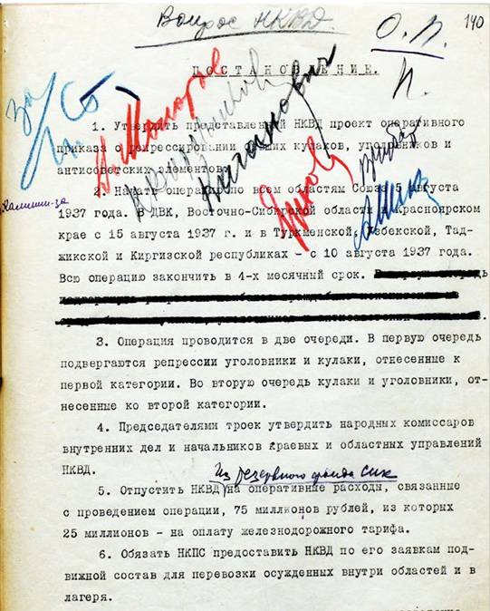 Постановление Политбюро ЦК ВКП(б) от 31 июля 1937 г. утвердило подписанный днём ранее оперативный приказ народного комиссара внутренних дел СССР № 00447 об операции по репрессированию бывших кулаков, уголовников и др. антисоветских элементов. Приказ был подписан наркомом Н. Ежовым и его заместителем, начальником Главного управления государственной безопасности М. Фриновским. Лица, отнесённые к первой категории, подлежали расстрелу, ко второй – заключению в тюрьмы и лагеря. (ГАРФ)