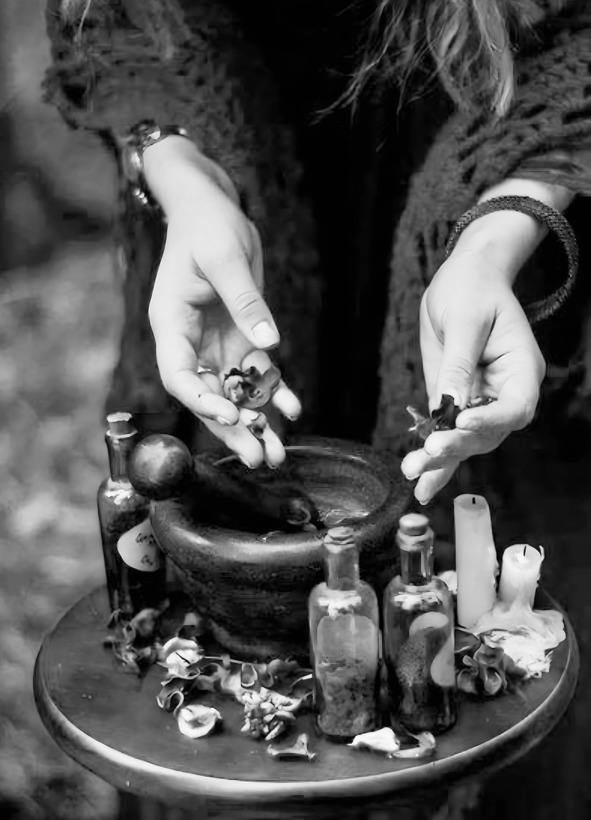Все ингредиенты смешать и растолочь в ступке. Затем пересыпать в чашу и, держа ее в руках перед собой, ближе к губам, так, чтобы дыхание касалось смеси, произнести слова заклинания: