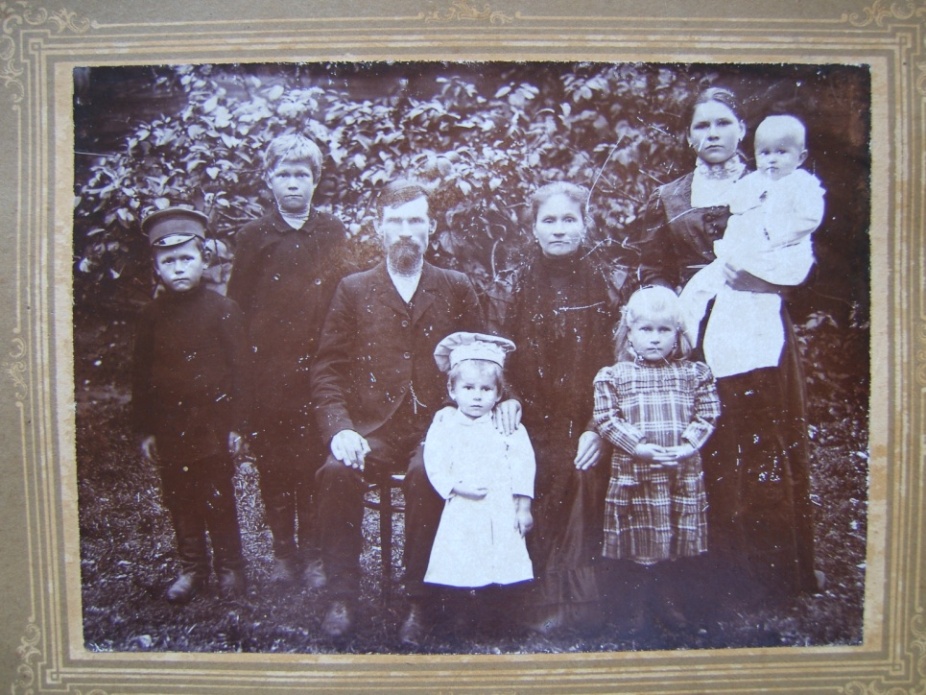 Слева направо: Николай, Петр, Василий Иванович, Алексей, Мария Гавриловна, Клавдия, и Павел на руках у няньки (?). Корчева, двор собственного дома, около 1910-11 года