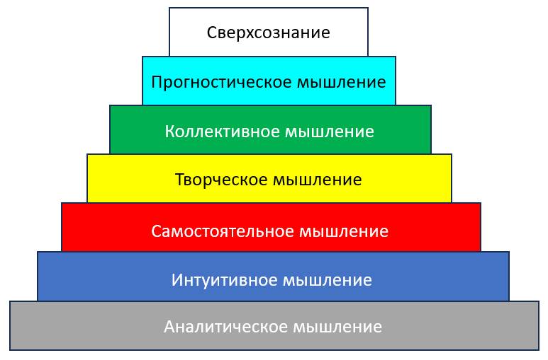 Развитие сознания и освоение новых типов мышления отражает Пирамида Сознания. Она состоит из семи ступеней. Переход с одного уровня на другой происходит в строгой последовательности. Невозможно перепрыгнуть через несколько ступеней пирамиды и попасть сразу на самый верх. Только последовательная работа над собой дает возможность достичь верхних уровней и открыть сверхсознание.