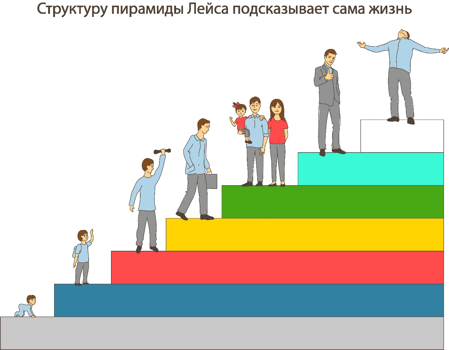 Приведенные примеры – это метафоры, при помощи которых вам будет легче понять концепцию пирамиды Лейса. В развитии личности нет жесткой привязки к возрасту. Некоторые люди всю жизнь находятся на первой-второй ступени, а иные достигают последнего уровня задолго до наступления старости. Но этапы личностного роста сменяют друг друга в строгой очередности во всех сферах жизни. Нельзя перепрыгнуть через несколько личностных уровней и переместиться сразу на верхние ступени пирамиды.