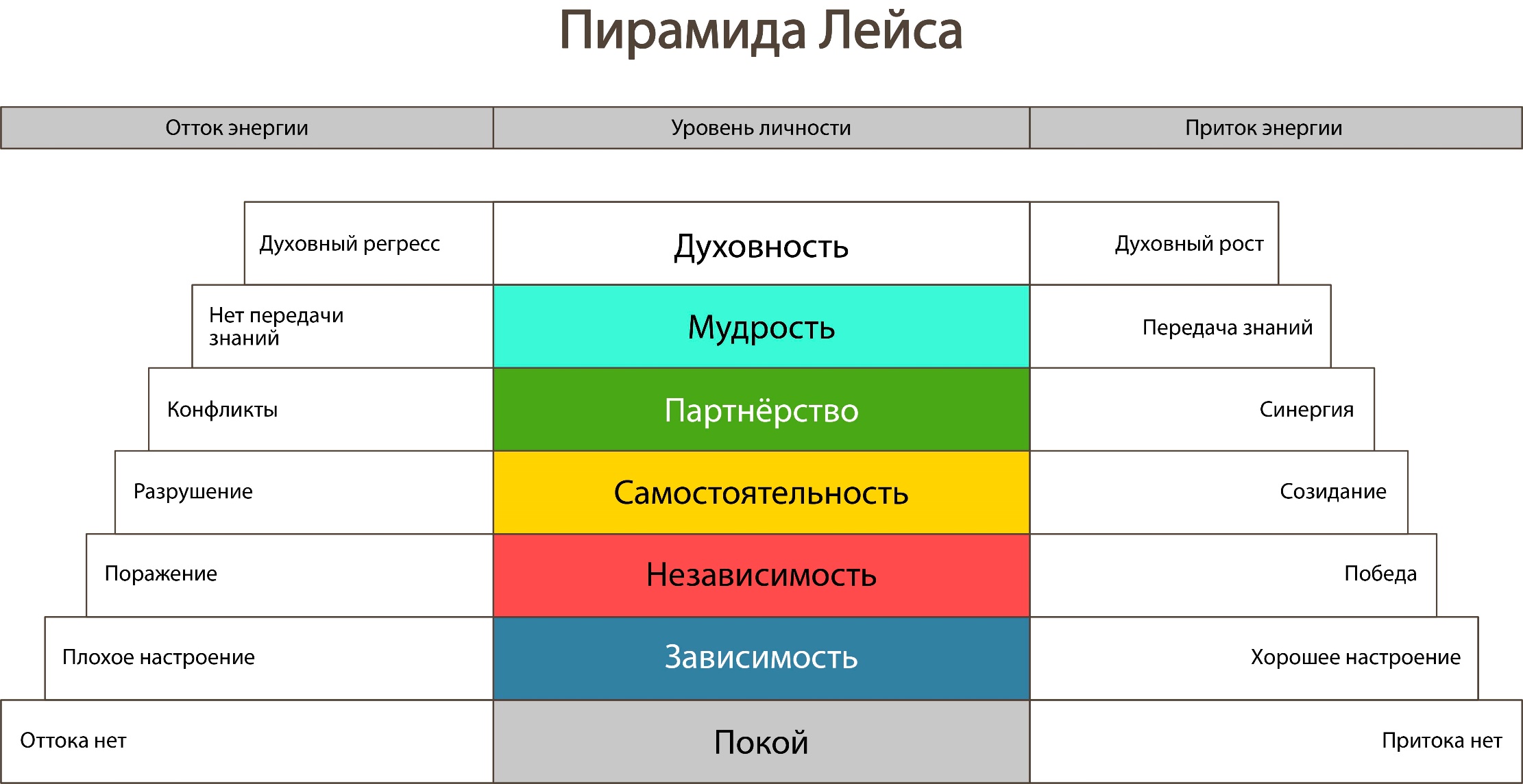 Каждому уровню присущи свои источники жизненной энергии – факторы, благодаря которым человек чувствует себя счастливым, мотивированным и успешным. Пирамида Лейса показывает, где брать энергию для жизни.