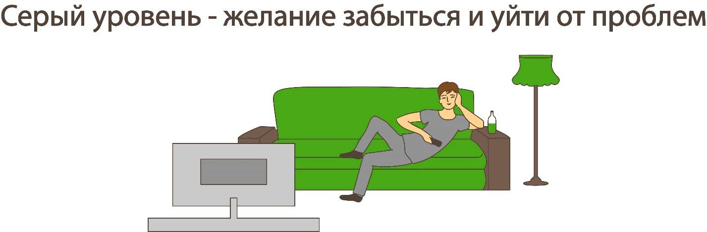 Уровень «Покой» (Серый уровень). Серый цвет данной ступени пирамиды символизирует пепел, землю, а название «Покой» (от слова «покойник») – застой, отсутствие движения, забвение. У людей, находящихся на данном уровне, практически полностью отсутствует энергия для жизни. Они, словно высосанная пауком муха – оболочка есть, а внутри пусто. Такое состояние может возникнуть, когда человек испытал сильное потрясение: потерял любимого, родственника, друга или дело всей жизни. Если человек не в состоянии эффективно справиться со свалившимся на него горем, то он фактически опускается на данную ступень пирамиды. Другой вариант – постепенная личностная деградация, сужение круга интересов до нескольких составляющих «сон – еда – телевизор –алкоголь».