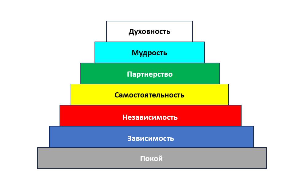 Согласно этой концепции, личность, развиваясь, последовательно проходит семь этапов, или по-другому уровней, каждый из которых в значительной степени определяет мысли, цели, решения и поступки человека.