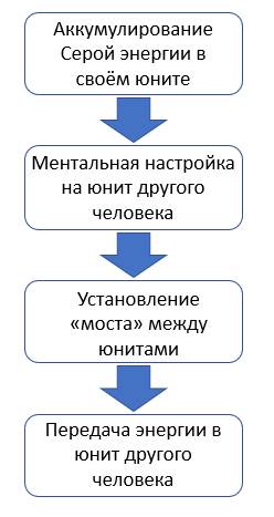Следующий этап – передача энергии. Маг направляет свою Серую энергию юнит больного. Этот процесс может длиться неопределенное количество времени: от нескольких минут, до нескольких часов. Просто в определенный миг целителю приходит понимание, что юнит больного заполнен оптимально и большее количество энергии перекачивать не следует. На этом сеанс передачи заканчивается.