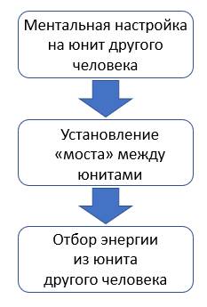В спокойной и уединенной обстановке, он мысленно представляет Серый юнит человека. Далее маг устанавливает связь между своим юнитом и юнитом оппонента, ментально протягивая между ними мостик. Затем маг мысленно начинает притягивать энергию из юнита другого человека в свой собственный. Передача может длиться неопределенное время (минуты, часы). Зачастую имеет место проговаривание имени человека, в отношении которого ведется воздействие, а также специального набора фраз, общий смысл которых сводится к тому, что у недруга ухудшится здоровье. Так осуществляется отъем энергии.