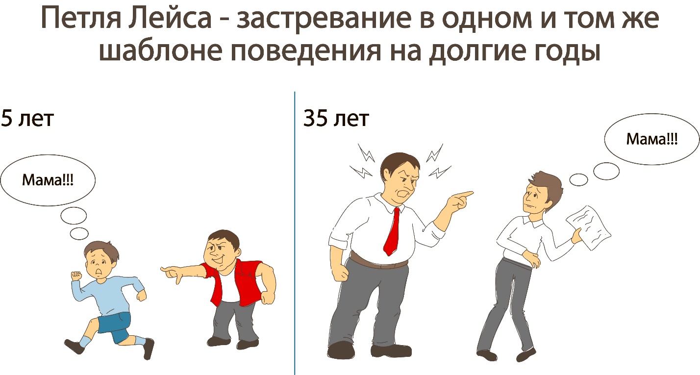 Еще один пример: поиски защитника и помощника в любой проблемной ситуации. В детстве ребенок, сталкиваясь с какими-либо опасностями или трудностями, сразу зовет на помощь родителей. Вырастая и вступая во взрослую и независимую жизнь, он продолжает реализовывать укоренившийся сценарий. Только в качестве защитника уже выступает муж или жена, друг, начальник. Не хватает у личности внутренней силы и уверенности в себе, чтобы самостоятельно решать свои проблемы и противостоять жизненным невзгодам. Это и есть застревание в петле Лейса.