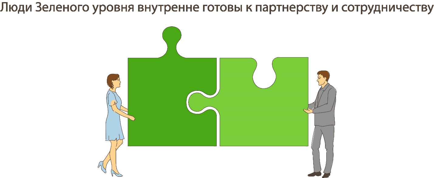 Уровень «Партнерство» (Зеленый уровень). Пятая ступень пирамиды имеет зеленый цвет – это тона природы и гармонии. Человек начинает смотреть на жизнь сквозь призму сотрудничества, а не отшельничества или конкуренции. Он стремится выстраивать отношения с другими людьми таким образом, чтобы каждый остался в выигрыше. Это дает возможность создавать надежные отношения с друзьями, крепкую счастливую семью, сплоченный рабочий коллектив.
