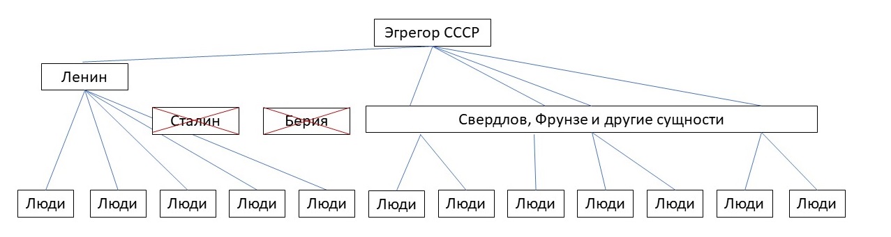 Возвышение или забвение сущностей происходит при непосредственном участии личностей, оказывающих на общество сильное влияние. В данном примере такой личностью стал Хрущёв. Следует отметить, что сущность Сталина была настолько сильна, что не погибла в результате этих действий, а продолжила жить и существует по сей день. Свидетельством этому является возрождение памяти об этом человеке, воспевание его достижений и даже желание определенной части социума, чтобы он материализовался и «навел порядок». Советский Союз как держава исчез с карты мира, но эгрегор СССР продолжает жить, его жизнеспособность поддерживают сущности, которые смогли пережить развал этой страны. Более того, он продолжает влиять на умы людей, живущих на данных территориях, наряду с другими эгрегорами. Какие-то из эгрегоров имеют в настоящий момент времени большую силу, другие – меньшую. Исходя из этого, они образуют иерархическую структуру, уровни которой соответствуют мощи того или иного эгрегора: чем выше уровень, тем больше могущество и влияние.