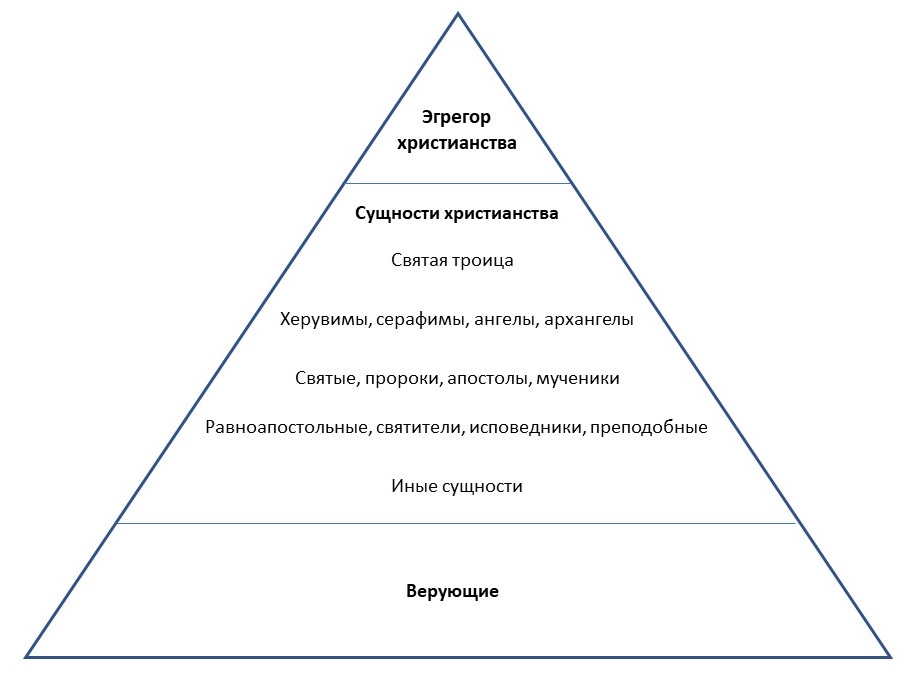 Эгрегор христианства имеет множество сущностей, обладающих сильным влиянием на людей. Эти сущности – ангелы, апостолы, святые, праведники, подвижники, мученики – словом, личности, внесшие существенный вклад в становление и развитие этой религии. В каждом храме, а также в домах, автомобилях, рабочих кабинетах и других местах люди размещают изображения этих сущностей – иконы, образа, лики и пр. Молитвы возносятся не только Богу, но и святым, как проводникам или связующим звеньям между человеком и Творцом. Каждая такая молитва укрепляет не только сущность Христа, но и сущность конкретного святого. Например, в России наиболее почитаемыми святыми являются Николай Чудотворец, Сергий Радонежский, Серафим Саровский и ряд других. Соответственно, к ним люди обращаются чаще и больше, нежели к другим.