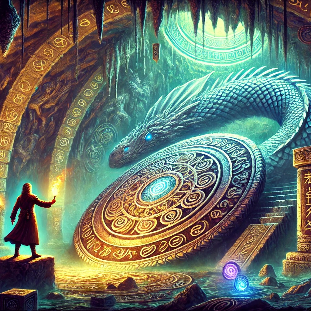 Он прошёл дальше и оказался в центральном зале. Здесь, на огромной плите в центре комнаты, был вырезан символ дракона, обвивающего меч. Это место казалось сердцем монастыря.