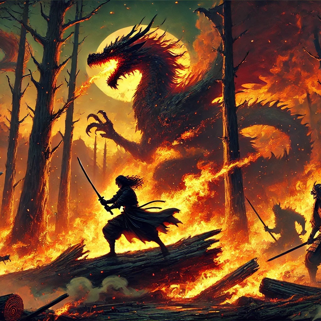 Огонь поглощал дома, люди метались в панике, пытаясь спасти свои семьи и имущество. Среди этого хаоса Рэн заметил фигуры людей в военной одежде, которые явно были не жителями. Это были воины в чёрных доспехах, их лица скрывали маски в форме драконьих черепов.