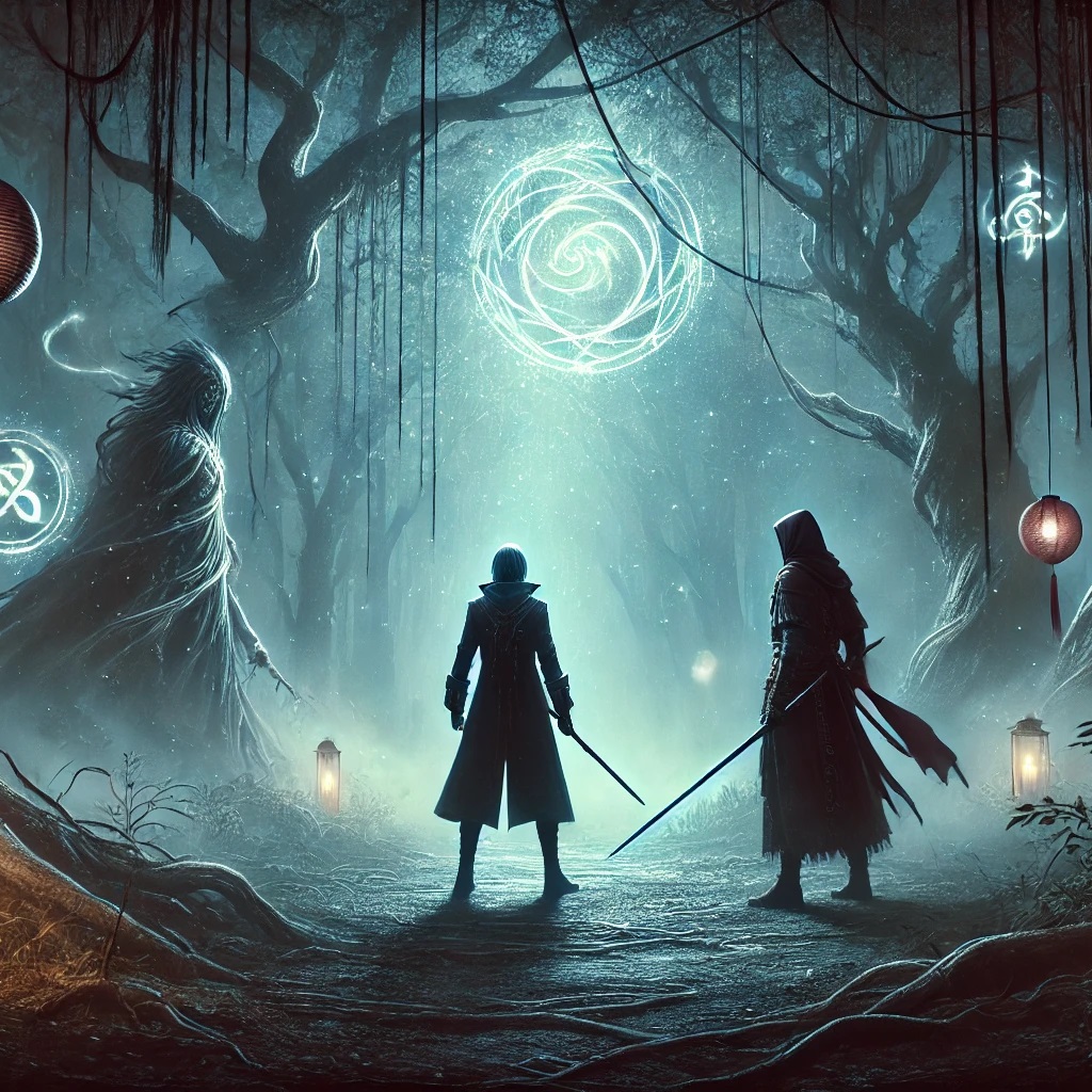 Сумерки опускались на землю, окутывая мир серым туманом. Узкая тропа, по которой шли Рэн и Аканэ, петляла среди низких холмов, скрытых густыми зарослями деревьев. Лес вокруг казался живым, каждое движение ветра, каждый шорох листьев напоминали тихий шёпот невидимых глаз.