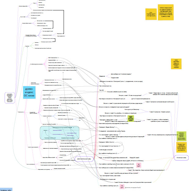 Вот такие три нити (пронумерованные главы, материал между ними, описания сновидений) и сплетают косицу этой книги. Материалы её создавались в разное время, хронология их написания не всегда соответствует порядку изложения. Для соблюдения и отслеживания логики повествования я использовал инструмент MindMap. Вот как выглядит финальный вариант (картинка специально нечитаема, ею я лишь иллюстрирую свои подходы к работе):