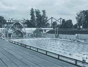 Предавшись метафизике, нельзя не сказать, что вообще-то именем «Москва» изначально назывался совсем другой бассейн – нынешняя «Чайка». Он появился немного раньше и в отличие от «Москвы» имел гораздо более внятный образ. Правда, невзирая на то что построена «Чайка» к Фестивалю молодёжи и студентов 1957 года, архитектура ее была не то чтоб очень молодежна: над входом поднималась овальная ротонда, которую фланкировали белоснежные беседки с колоннами. Впрочем, позже критики напишут, что «авторы уклонились от характерного в те годы прямого заимствования форм и деталей, сохранив при этом присущую подлинной классике гармоничность пропорций», то есть проявили еще не очень присущее эпохе диссидентство. Ансамбль с наземным павильоном станции метро «Парк культуры» и Провиантскими складами действительно получился гармоничным, особенно тонко вторят ампиру складов полуциркульные окна бассейна. При этом авторы не впали ни в украшательство (как в бассейне ЦСКА 1954 года), ни в гигантизм (как в лужниковском бассейне 1956 года), а создали необычайно уютный, по-настоящему парковый комплекс – даром что в старинном саду дворца великого князя Михаила Павловича (правда, сам ампирный шедевр Афанасия Григорьева испарился еще в конце XIX века).