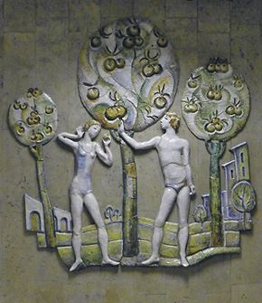 А там, где у Топаза был гардероб, сделали остекленное кафе, практически в уровне с водой – еще одна чудесная находка в духе 60-х, но и память о ротонде, имевшей тот же овальный план. А деревянные трибуны как были, так и остались, и по сей день используются не только по прямому назначению, но и как лучшее в центре Москвы место для загорания. И откуда так хорошо обозревается старообрядческий храм в Турчаниновом переулке, расположенный, слава богу, не на месте бассейна, а ровно напротив. Откуда, в свою очередь, совершенно не виден «срам» – керамический горельеф Аделаиды Пологовой в коридоре бассейна: два молодых человека под яблоней – Адам в плавках и Ева в купальнике.
