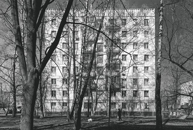 Наилучшие показатели были у панельных восьмиэтажных башен, которые и пустили в серию, добавив один этаж. Четырехэтажные же дома стали основой для пятиэтажек, которые тоже стали строить главным образом из железобетонных панелей, выпуск которых наладили домостроительные комбинаты, первый из которых открылся в Москве в 1961 году. Черёмушки оставались местом экспериментального строительства и в 1960-х – от 9-го квартала за пять минут можно дойти до Дома нового быта [27], тоже спроектированного Натаном Остерманом. Но самое главное – название исчезнувшей деревни стало синонимом микрорайона и символом новой радостной жизни в новой отдельной квартире. Этому и посвящена написанная в 1958 году оперетта Дмитрия Шостаковича «Москва, Черёмушки», а благодаря поставленному по ней фильму Герберта Раппопорта (1963) мы можем представить себе, каким чудом и счастьем было тогда скромное жилье, которое позже стали презрительно называть «хрущобами».