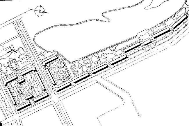 ➧122-й квартал, по сути, повторил планировку предшествующих, дома даже немного загибаются за углы участка – и это при том, что раннее панельное домостроение всячески избегало угловых секций, усложнявших процесс монтажа. 123-й квартал стал практически линейным, вытянувшись вдоль улицы Седова, но только потому, что с противоположной стороны к нему подступает большой водоем, – если бы строительной реформы не произошло, дома, скорее всего, встали бы примерно так же.