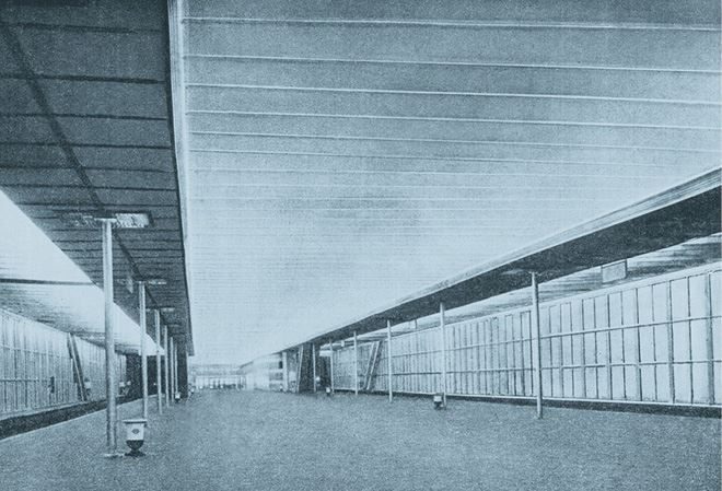 Поскольку же главным украшением станции были виды, то внутри она лишена всяческой «красоты» – и в этом смысле была абсолютной сенсацией. Разве что волнообразное перекрытие среднего нефа выглядело эффектно, но и оно при этом сугубо конструктивно. А так – асфальтовый пол, столбы вместо колонн, вместо роскошных люстр – авангардные «мобили» светильников. А по вечерам метромост превращался в удивительно уютный брусок света, невзирая на то что располагался в модернистских координатах: парил в воздухе, отражался в воде и вибрировал при каждом проходе поезда.