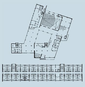 Компоновка здания намекает на знакомство авторов с постройками экспериментального района Interbau в Западном Берлине, где в 1957 году международная команда архитекторов предложила новые решения современного многоквартирного жилого дома. Вытянутый в ширину параллелепипед покоится не на корбюзианских опорах, а на подиуме цокольного этажа, конструкции которого выполнены в монолитном железобетоне, а наружные стены почти полностью застеклены, что создает иллюзию парения и одновременно обеспечивает взаимопроницаемость внешнего и внутреннего пространства. Этот эффект особенно заметен в темное время суток, когда загораются светильники, в одном и том же ритме вмонтированные в козырек над входом и в потолок холла.