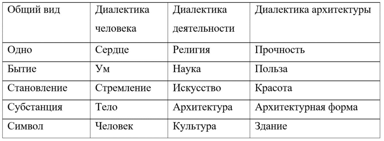 Тело здесь выступает как субстанция, осуществляющая триединую стихию сердца, ума и стремления. В сфере человеческой деятельности ей будет соответствовать триада религии, науки и искусства. Религия является той единственной стихией, которая захватывает последнюю глубину существа человека – сердце, и которая призывает принести в дар это сердце Абсолюту. Деятельность ума есть наука. Стремление выражается в жажду и поиск красоты, оформляясь в искусство. В человеке сердце, ум и стремление воплощает тело, а в деятельности человека религию, науку и искусство воплощает архитектура. Отсюда же исходит знаменитая триада Витрувия – прочность, польза, красота, воплощаемые в архитектурной форме. Таким образом, возникают следующие диалектические ряды:
