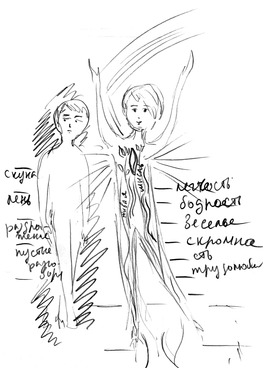 Философья в этот день не пришла вовремя на репетицию (задержалась на семинаре), и скрипка и контрабас поссорились. Скрипка сказала: я самая возвышенная, и контрабас не нужен. А контрабас завыл: нет я большой и самый главный. Дело чуть было не дошло до драки, если бы вовремя не поспела виолончель. Не ссорьтесь, сказала она, и скрипка вовремя нужна, и контрабас нам нужен, но чтобы вас соединить, звучать я тоже буду. Мой звук – срединный, между вами, летит пониже скрипки, но выше баса контрабаса, а вместе мы – триада: высокий, низкий, средний. Краям нам нужно дать средину, гармонию – союз.