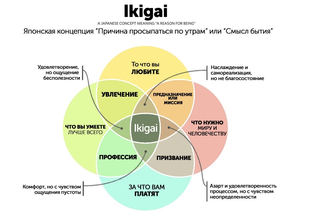 Помочь найти свой икигаи может также изучение профессий, и для этого существует целая наука – профориентация. Например, в ней говорится о том, что есть профессии в которых работа тесно связана с людьми, либо с природой, либо со знаками (текстом, формулами). Каждый человек приходит в мир с определенными талантами, которые могут раскрыться в его профессиональной деятельности.