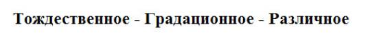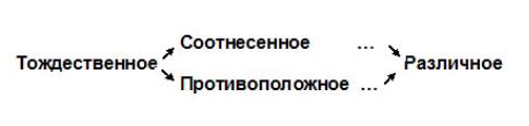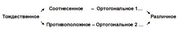 Что же нового с аристотелевскими началами делаем мы? Прежде всего, разделяем понятие «противоречащее» на два понятия – Тождественное и Различное, тогда как остальные виды противолежания, напротив, объединяем в одно понятие – Градационное, которое размещаем между предельными абстракциями отождествления и различения, т. е. между тождеством и различием.