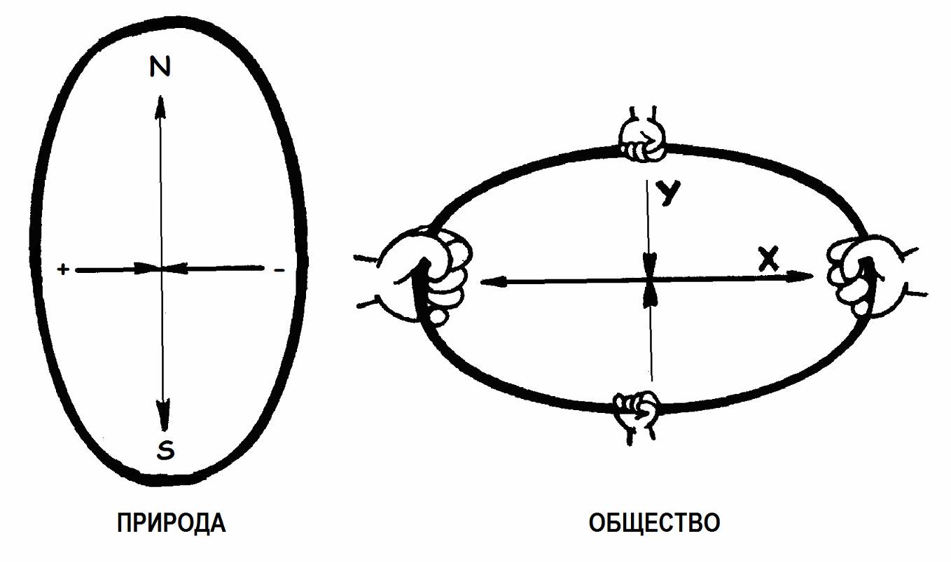 Так движущей силой природы является обусловливающая самодвижение сходящаяся пара противоположностей, вызванная тем, что «избыток» одной из их сторон компенсирует «недостаток» другой стороны в промежуточное между ними значение. Поэтому Бог Всесильный не занимается каждым из бесчисленного множества отношений в отдельности. Тогда как движущая социальная сила, направляется свободной волей и сознанием каждого отдельного человека и является расходящейся парой противоположностей, направленной на получение «избытка» одной стороной отношения и «недостатка» другой его стороны.