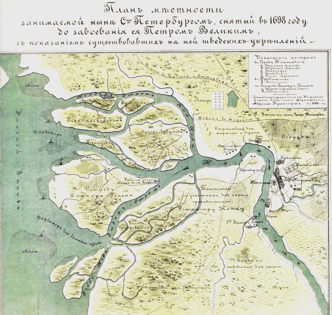 Войска Петра, пробивая «окно в Европу», прошли тот же путь по Невскому «водному проспекту»: крепость Нотебург (Орешек) у истока Невы – взята 11 (22) октября 1702 года; крепость Ниеншанц в устье Охты – взята 1 (12) мая 1703 года7; бой за остров Котлин –9 (20) июля 1704 года, когда шведы попытались вернуть устье Невы.