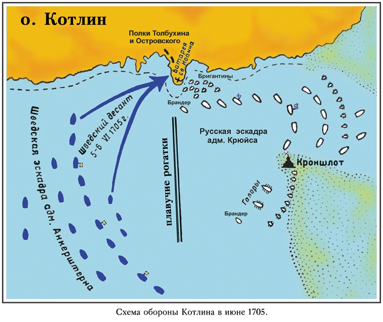 4 (15) июня 1705 года шведский флот под флагами адмирала Корнелиуса Анкерштерна и второго флагмана вице-адмирала Якоба де Пру вновь подошёл к Котлину. Шведы планировали теперь сильную комбинированную атаку: флот артиллерийским огнём и десантом уничтожает Кроншлот и другие укрепления на Котлине, затем прорываются к Петербургу и одновременным ударом с суши и моря штурмом берут Петропавловскую крепость.
