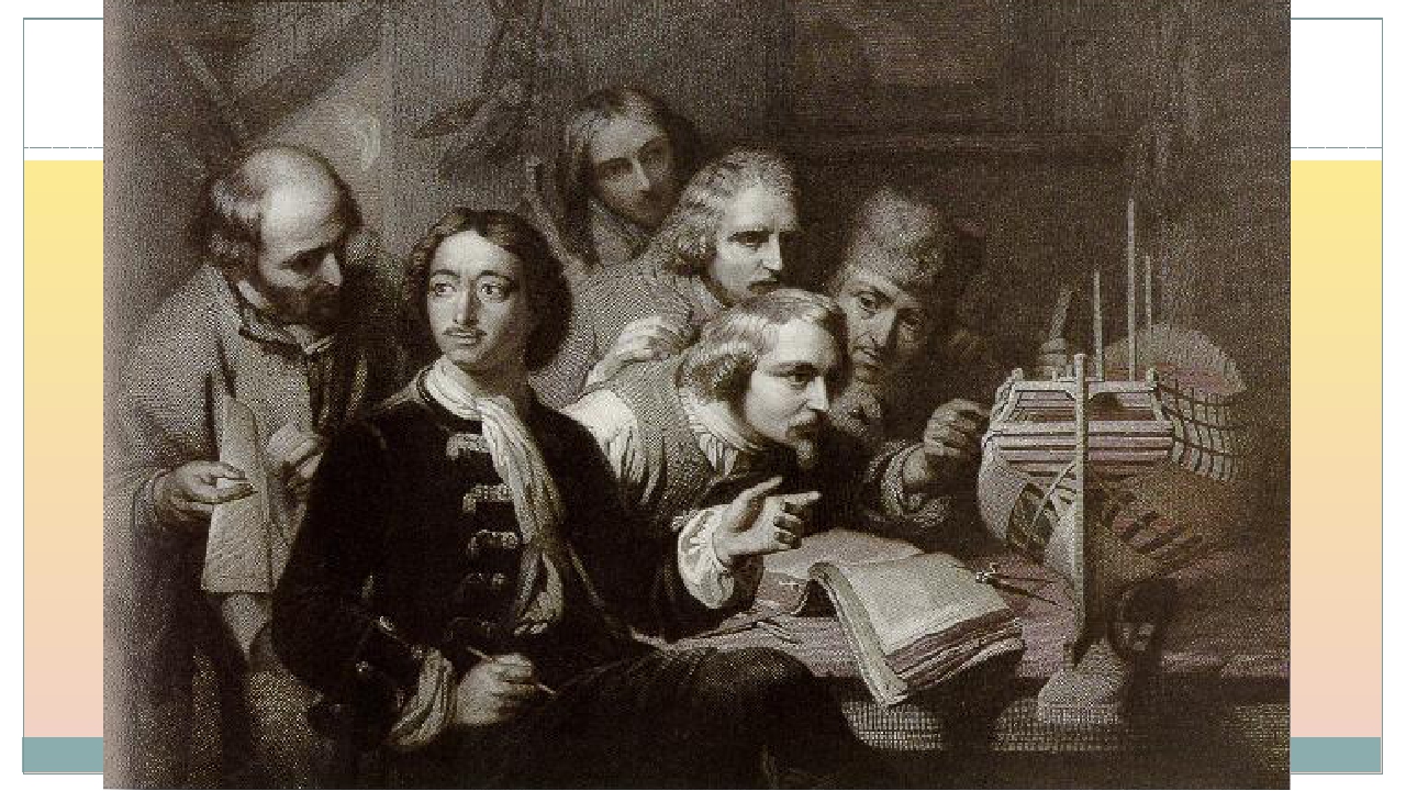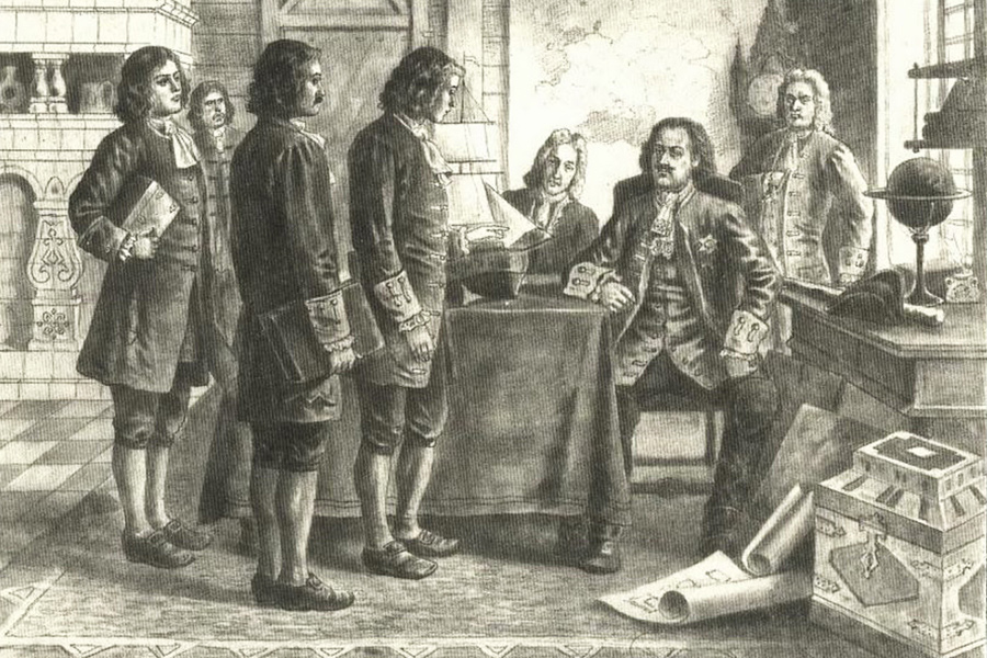 Для её решения царь использовал два пути. Во-первых, пошли на выучку к Западу – к лучшим иностранным специалистам. Уже в состав Великого посольства была включена большая группа волонтеров, чтобы на месте изучить практику и теорию морского дела в Голландии, Англии и Венеции. В дальнейшем царь постоянно отправлял на учебу за границу молодых людей.